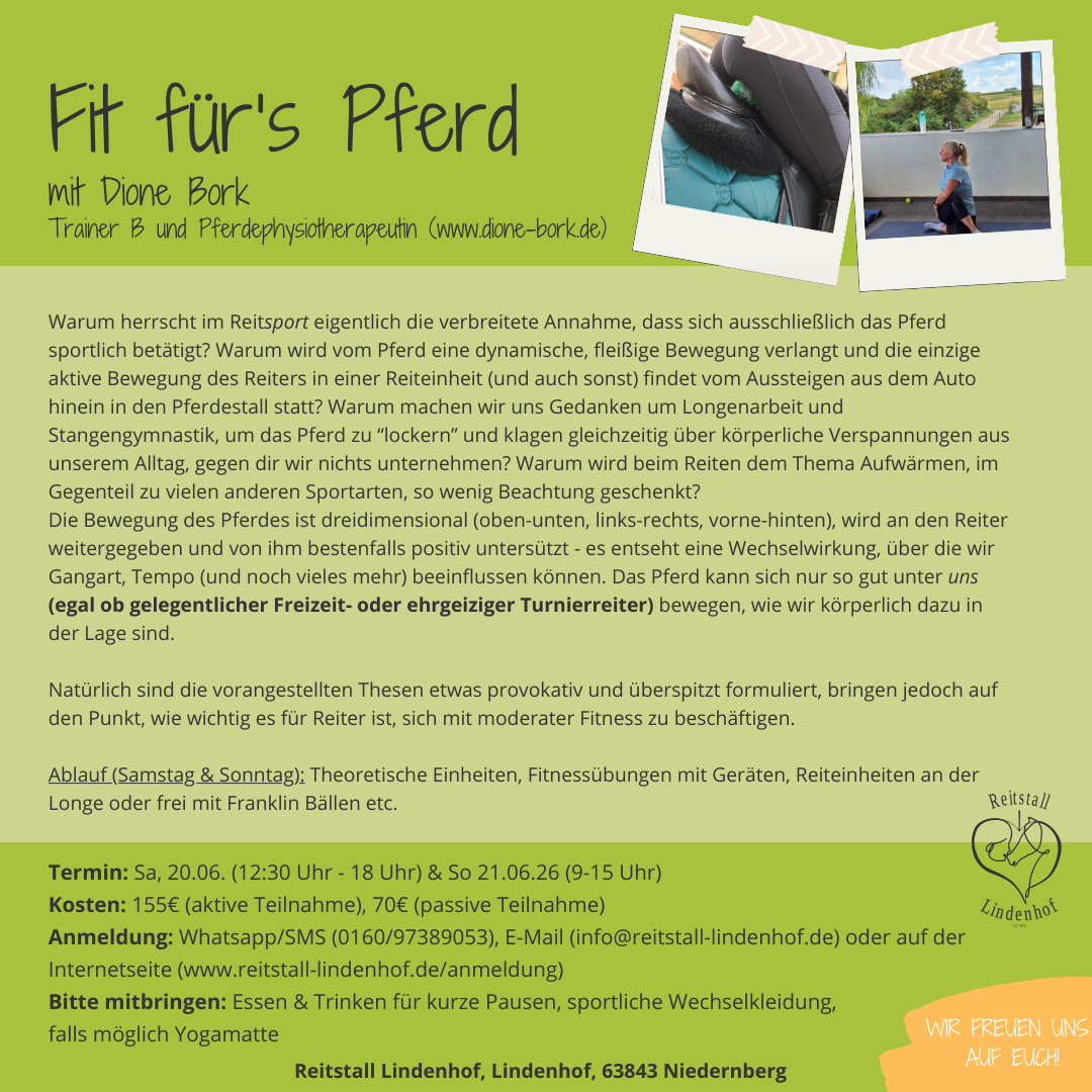 Um dich für diese Veranstaltung zu registrieren, besuche den folgenden Link: http://info@reitstall-lindenhof.de/anmeldung →