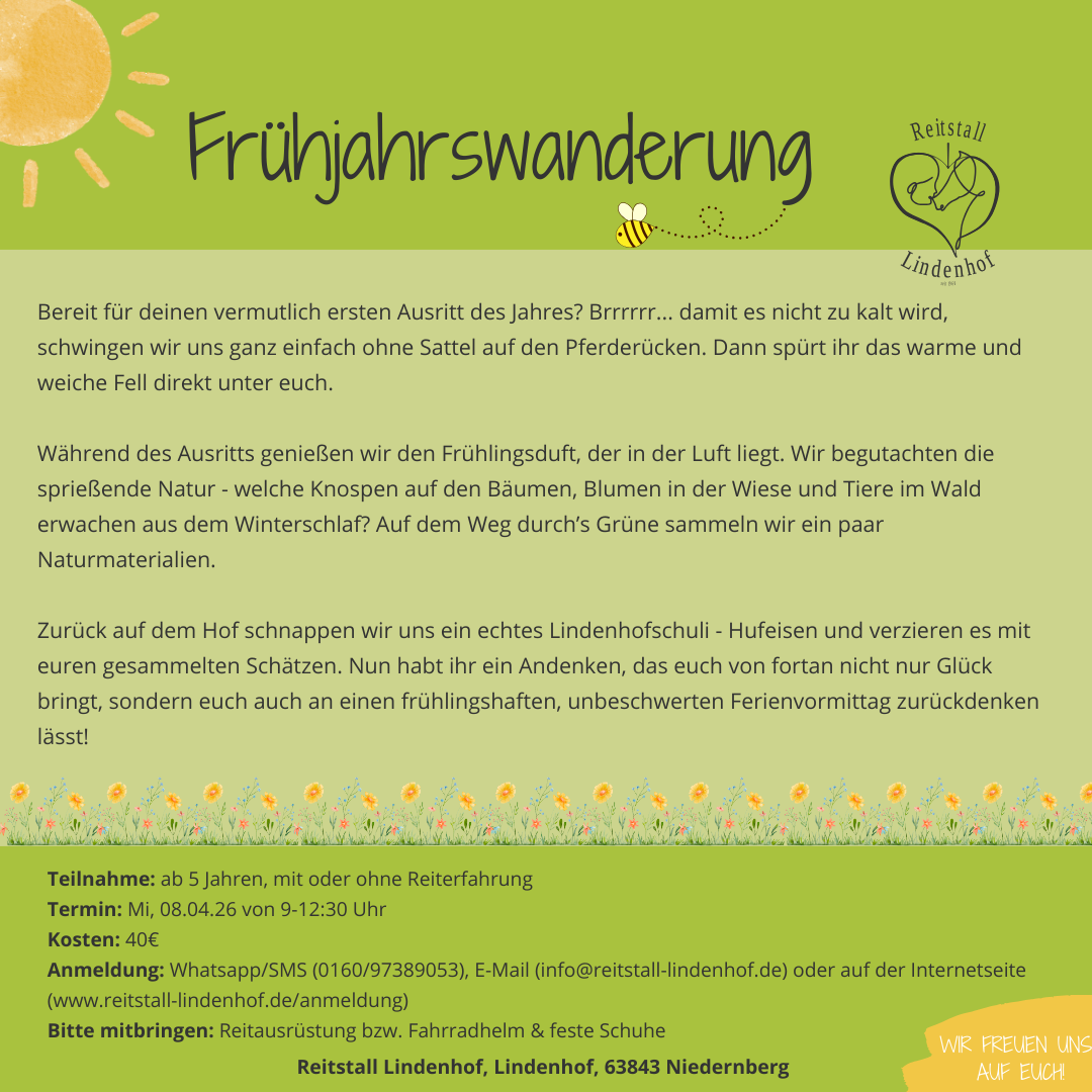 Um dich für diese Veranstaltung zu registrieren, besuche den folgenden Link: http://info@reitstall-lindenhof.de/anmeldung →